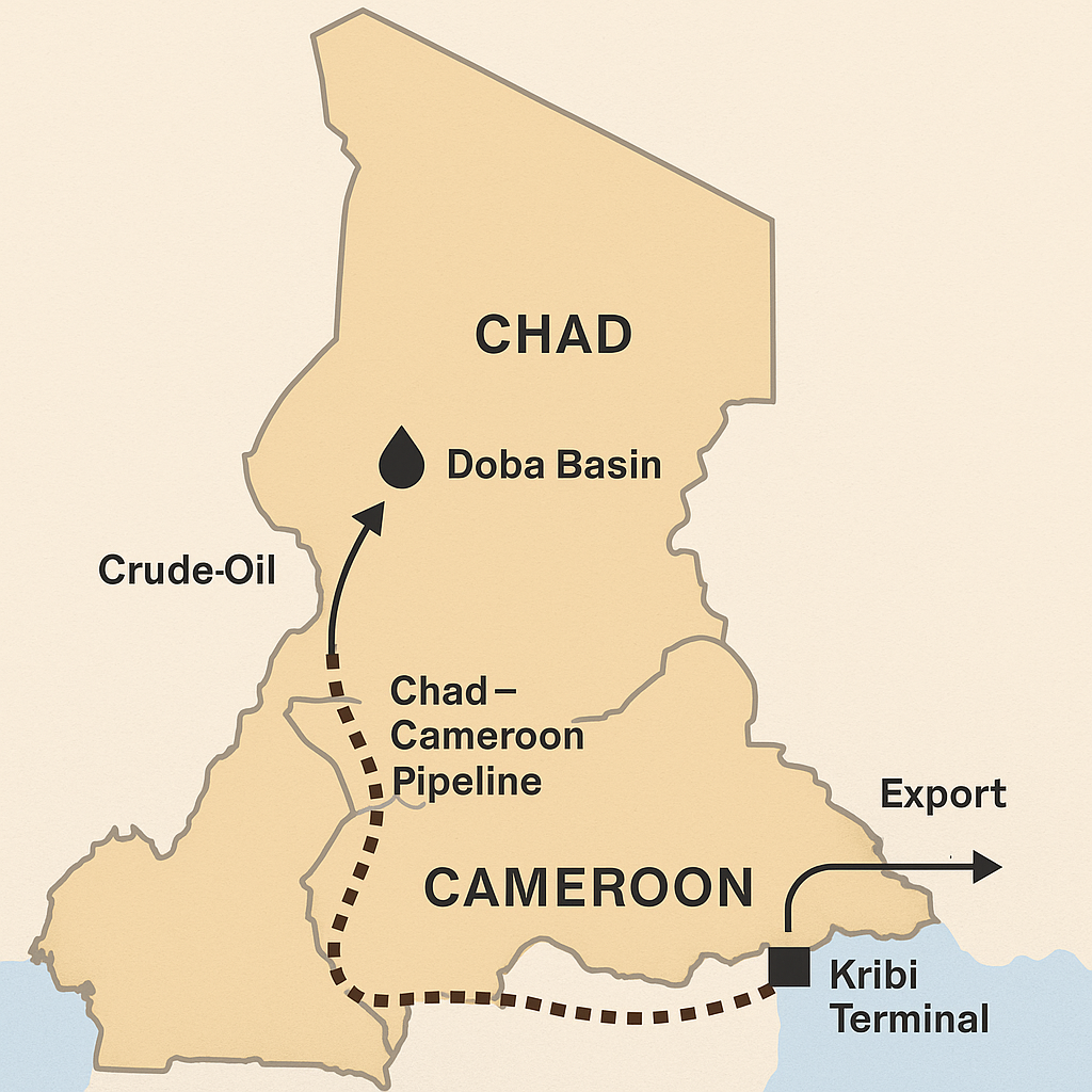 Exports flow via the Chad–Cameroon pipeline to the Kribi terminal.